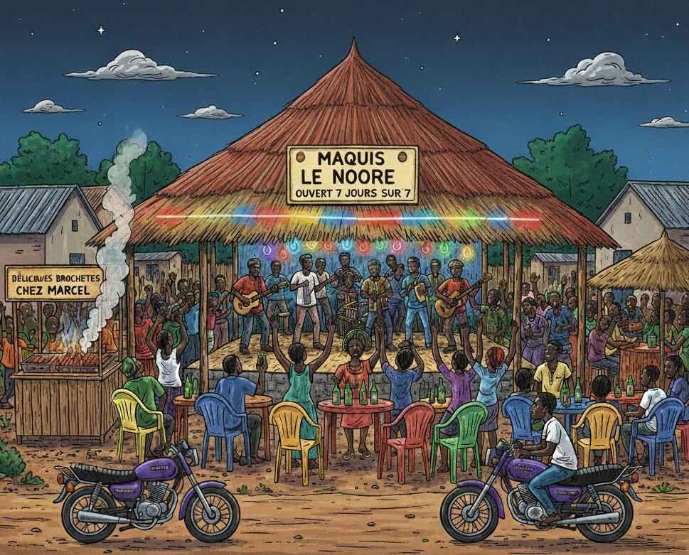 Aux heures où la poussière ocre se fige et où la bière coule à flot sous le néon ardent, l'air est lourd des odeurs de braise et d’épices. C'est l'ambiance des maquis, les cabarets du Burkina Faso (à Ouaga et au-delà), et c'est dans ce circuit exigeant que se forge la meilleure école de musique.C’est là qu’Ahmed Cissé a appris la maîtrise du live, l'exigence et un répertoire pléthorique. Dans ce creuset se sont formées des générations de musiciens burkinabés.Pour le musicien du maquis, chaque soir il faudra arracher son Gombo, son cachet, qui permettra de payer l'essence et de revenir le jour suivant.Le Gombo qui a donné son nom au groupe désigne un style de musique mais aussi un mode de rémunération. Parler de Gombo frais c'est évoquer la musique dansante, facile disent certain. C'est aussi la rémunération payée au black, celle qui permet de vivre au jour le jour.